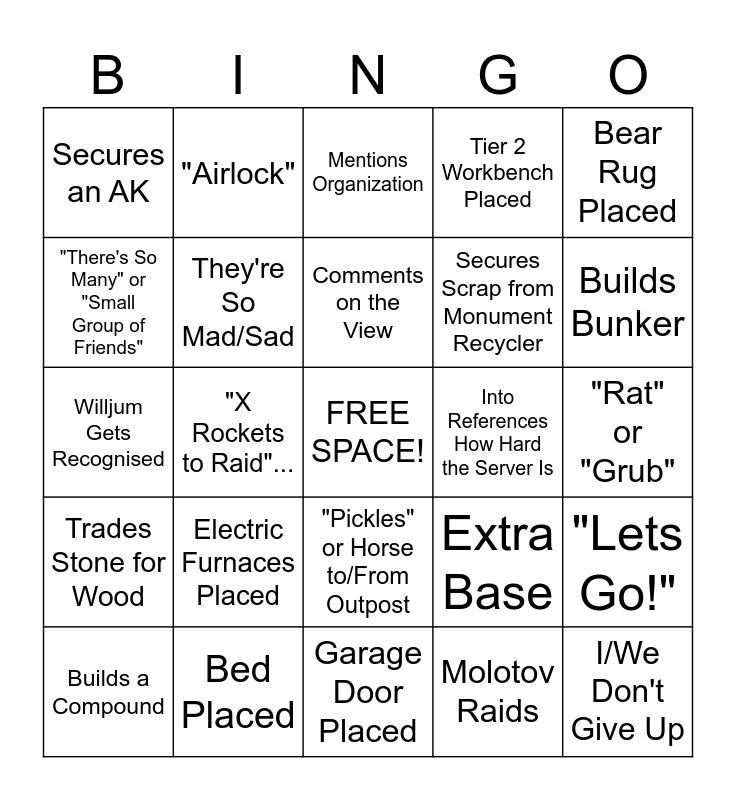 This bingo card has a free space and 37 words: Uses Spray Can, Base is Cozy, Minecraft Music, They're So Mad/Sad, "Lets Go!", Electric Furnaces Placed, Comments on the View, Manscaped Sponsor, Bear Rug Placed, "Yogi", "X Rockets to Raid"..., Tier 2 Workbench Placed, I/We Don't Give Up, "Rat" or "Grub", "There's So Many" or "Small Group of Friends", Trades Stone for Wood, Destroys a Wall (Not Demolish), Mentions Organization, "Pickles" or Horse to/From Outpost, Into References How Hard the Server Is, Secures an AK, Builds Bunker, Builds a Compound, Garage Door Placed, Comments on a Skin, Molotov Raids, "Airlock", "Honeycomb", Namedrops Someone (Counts Teammates), Talks About Channel, Views, Old Videos, etc., Willjum Jump Scared, Bed Placed, Willjum Gets Recognised, Upgrades Something to Armored, Extra Base, Secures Scrap from Monument Recycler and Kills Scientist.