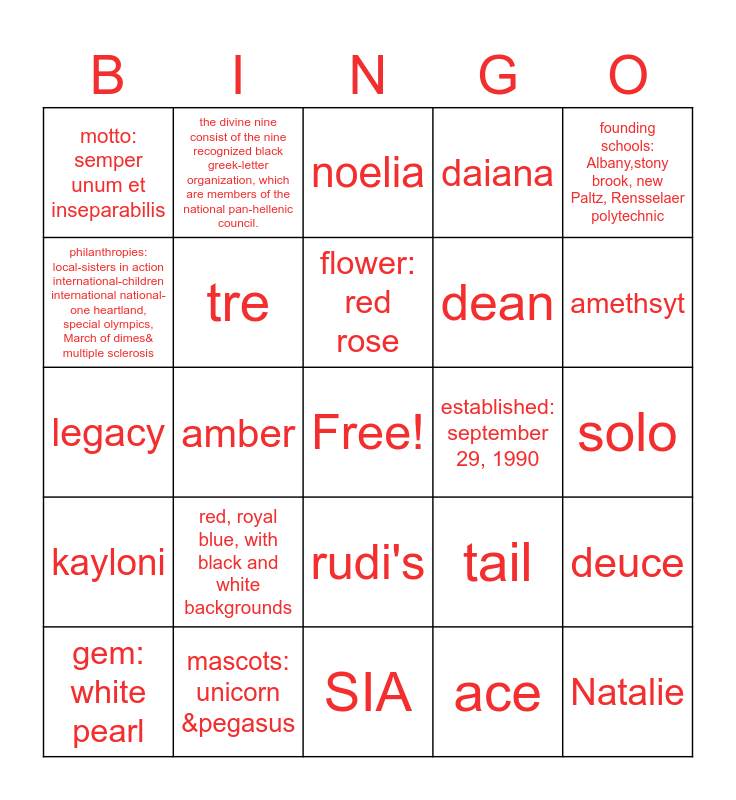 This bingo card has a free space and 24 words: red, royal blue, with black and white backgrounds, mascots: unicorn &pegasus, flower: red rose, gem: white pearl, founding schools: Albany,stony brook, new Paltz, Rensselaer polytechnic, motto: semper unum et inseparabilis, philanthropies: local-sisters in action international-children international national- one heartland, special olympics, March of dimes& multiple sclerosis, the divine nine consist of the nine recognized black greek-letter organization, which are members of the national pan-hellenic council., established: september 29, 1990, rudi's, dean, legacy, tail, deuce, tre, ace, solo, noelia, amethsyt, amber, Natalie, kayloni, daiana and SIA.