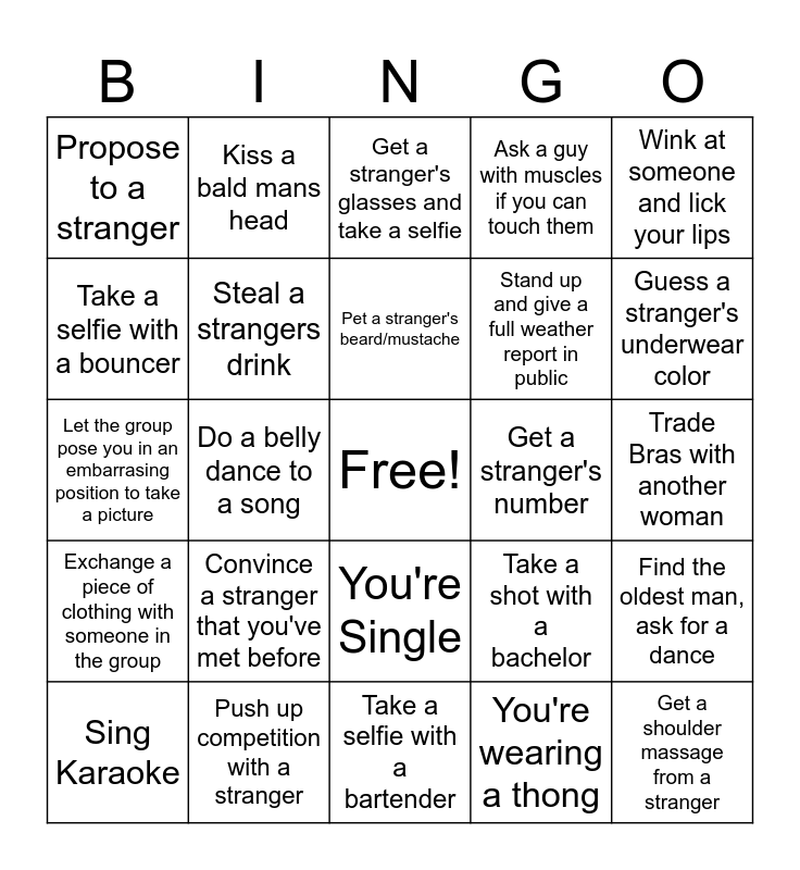 This bingo card has a free space and 26 words: You're Single, You're wearing a thong, Pet a stranger's beard/mustache, Push up competition with a stranger, Wink at someone and lick your lips, Propose to a stranger, Take a selfie with a bouncer, Kiss a bald mans head, Trade Bras with another woman, Take a shot with a bachelor, Stand up and give a full weather report in public, Let the group pose you in an embarrasing position to take a picture, Find the oldest man, ask for a dance, Sing Karaoke, Do a belly dance to a song, Dance on a table, Ask a guy with muscles if you can touch them, Exchange a piece of clothing with someone in the group, Get a stranger's glasses and take a selfie, Get a shoulder massage from a stranger, Guess a stranger's underwear color, Take a selfie with a bartender, Get a stranger's number, Convince a stranger that you've met before, Steal a strangers drink and Have someone buy you a drink.