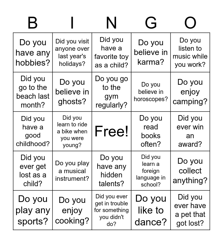 This bingo card has a free space and 24 words: Do you play a musical instrument?, Do you enjoy cooking?, Do you go to the gym regularly?, Do you play any sports?, Do you listen to music while you work?, Do you have any hobbies?, Did you go to the beach last month?, Did you visit anyone over last year's holidays?, Do you read books often?, Do you have any hidden talents?, Do you believe in horoscopes?, Did you have a good childhood?, Did you learn a foreign language in school?, Do you collect anything?, Do you believe in ghosts?, Do you like to dance?, Did you ever win an award?, Did you have a favorite toy as a child?, Do you enjoy camping?, Did you learn to ride a bike when you were young?, Did you ever have a pet that got lost?, Did you ever get lost as a child?, Do you believe in karma? and Did you ever get in trouble for something you didn't do?.