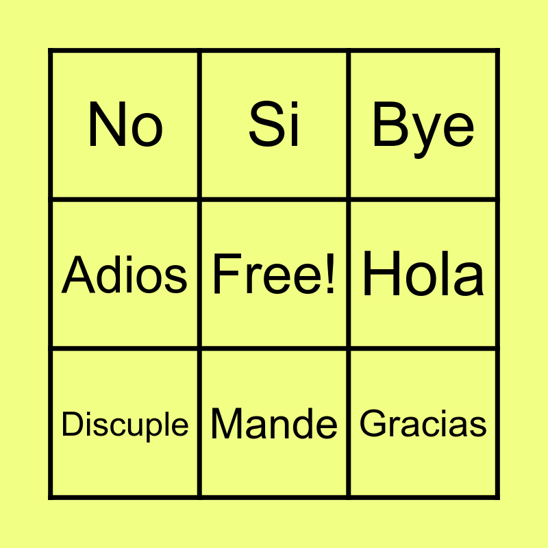 This bingo card has a free space and 8 words: Hola, Bye, Si, Discuple, No, Gracias, Adios and Mande.