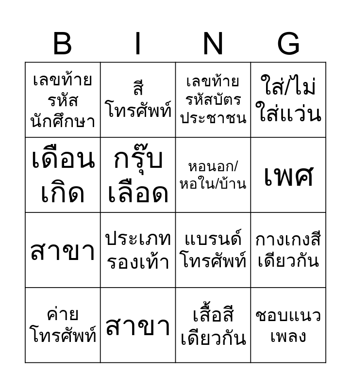 This bingo card has 21 words: สาขา, วันเกิด(จ.-อ.), สีโทรศัพท์, จังหวัดบ้านเกิด, เสื้อสีเดียวกัน, หอนอก/หอใน/บ้าน, เลขท้ายรหัสนักศึกษา, เลขท้ายรหัสบัตรประชาชน, แบรนด์โทรศัพท์, เพศ, สาขา, ใส่/ไม่ใส่แว่น, ชอบแนวเพลง, งานอดิเรก, กรุ๊บเลือด, ตัวอักษรแรกชื่อเล่น, ค่ายโทรศัพท์, ประเภทรองเท้า, เดือนเกิด, กางเกงสีเดียวกัน and เลขท้ายเบอร์โทร.