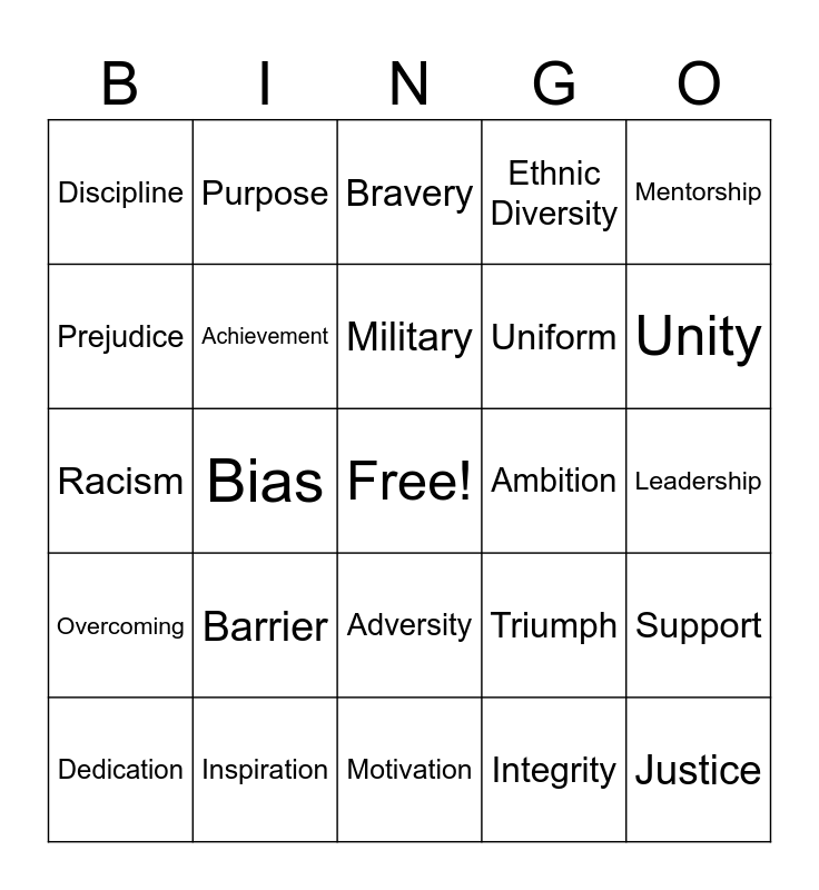 This bingo card has a free space and 40 words: Resilience, Racism, Sacrifice, Achievement, Inspiration, Adversity, Military, Legacy, Mentorship, Overcoming, Bias, Ethnic Diversity, Justice, Leadership, Ambition, Barrier, Pride, Discipline, Challenge, Bravery, Support, Integrity, Uniform, Prejudice, Role Model, Respect, Teamwork, Heroism, Commitment, Struggle, Service, Dedication, Success, Triumph, Unity, Motivation, Change, Character, Purpose and Victory.