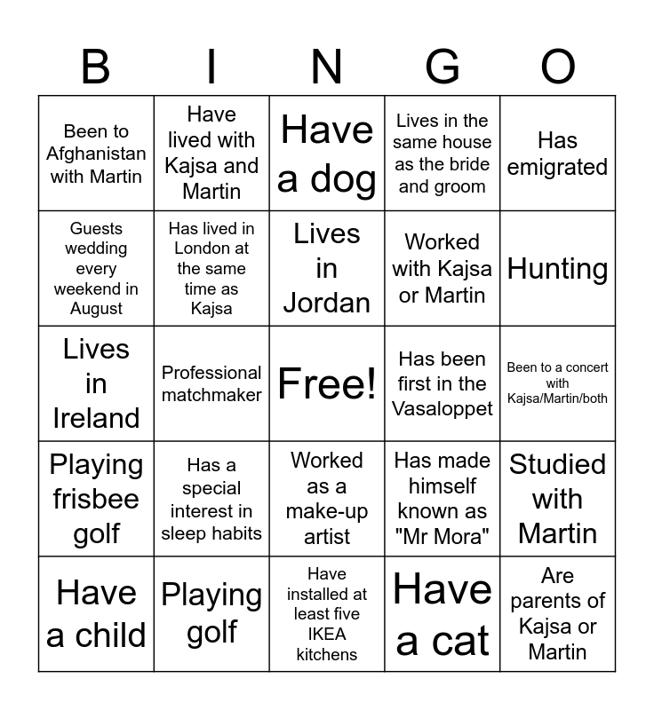 This bingo card has a free space and 96 words: Won the WC in orienteering, Spends the majority of his waking hours in the woods, Expert in folk costumes, Has been first in the Vasaloppet, Has ten great-grandchildren, Knows the entire Swedish regency length, Has survived all Ericsson notices since the 90s, Has ridden the Vasaloppet, Singing in choir, Is cousin to Martin, Is an artist, Is a teacher, Playing hunting horn, Hunting, Love statistics, Guests wedding every weekend in August, Lives in Jordan, Was there the first time the bride and groom met, Worked as a priest as a summer job, Martin's youngest cousin, Joined the stag party, Is from Småland, Worked at the embassy in Kabul, Runs a company that will teach two-year-olds to read, Worked as a make-up artist, Have installed at least five IKEA kitchens, Have celebrated Christmas day with Martin/Kajsa/both, Been to Afghanistan with Martin, Has participated in Stafettvasan with Martin, Raised on the Vasalopp track, Works in healthcare, Has made himself known as "Mr Mora", Have known Martin since childhood, Is a psychologist, Has emigrated, Lives in the USA, Studied with Martin, Lives in Gothenburg, Have seen Bruce twice during the summer, Professional matchmaker, Has competed in tricking, Have a child, Are parents of Kajsa or Martin, Playing golf, Playing frisbee golf, Have a dog, Have a poodle, Lives in Australia, Recently married, Is a pastry chef, Lives in Uppsala, Is Kajsa's cousin, Is from Karlskrona, Has won an Olympic medal, Is a hockey professional, Runs own business, Lives in a cemetery, Have dried flower petals before the wedding, Has the most cameras of anyone at the party, Have had snakes as pets, Has been chairman of one of two boards Kajsa has been on, but has not been chairman of, Have known Kajsa since preschool, Have slept the most nights in the loft in Martin and Kajsa's house in Mora, Been on a cycling holiday with Kajsa, Went to the theater with Kajsa, Has suited Vilma, Have paddled with Kajsa, Cooks incredible food, Have attended a carpentry course organized by the bride and groom, Have a cat, Have shared a dog with Kajsa, Playing fotball, Is a doctor, Spent parental leave learning to bake sourdough bread, Has been skiing with someone in the bridal couple, Have been on the most hiking trips with someone in Kajsa, Has been on a board with Kajsa or Martin, Has lived in London at the same time as Kajsa, Working with fish, Worked with Kajsa or Martin, Lives in the same house as the bride and groom, Have lived with Kajsa, Love elephants, Went to high school with Kajsa, Have drawn a Kurbits for the wedding, Lives in Ireland, Has a special interest in sleep habits, Has a newfound passion for lindy hop, Playing DnD, Been to a concert with Kajsa/Martin/both, Is a theater actor in his/her spare time, Have done yoga with Kajsa/Martin/both, Is a foreign correspondent, Has run my own company on the theme of tuna, Have lived with Kajsa and Martin and Works with Kajsa or Martin.