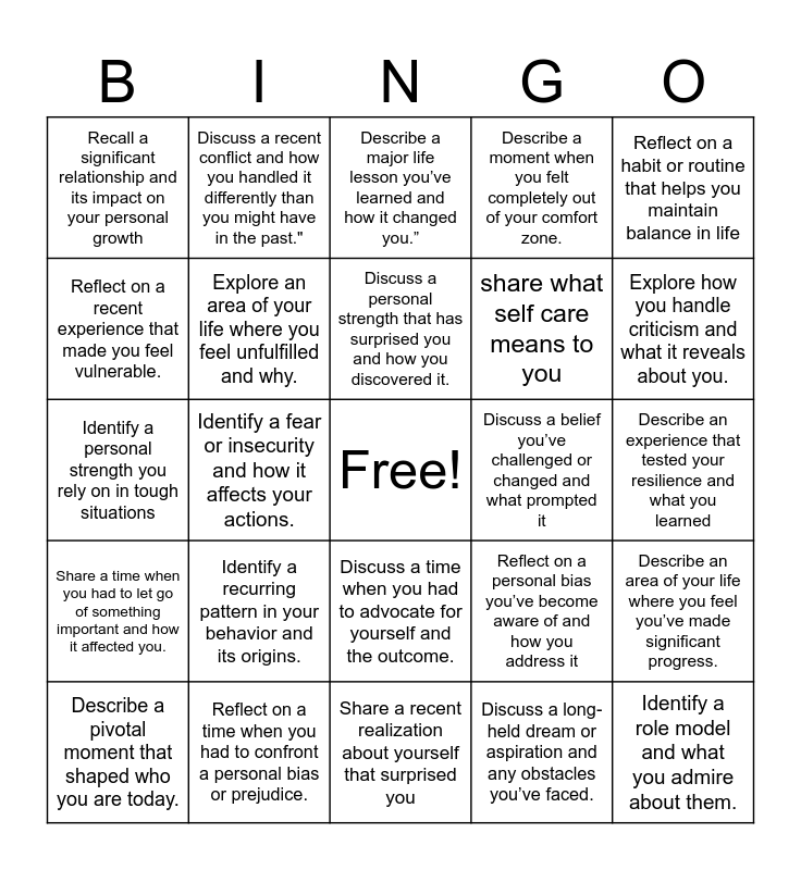 This bingo card has a free space and 29 words: Describe a pivotal moment that shaped who you are today., Reflect on a time when you felt truly authentic. What was different?, Identify a fear or insecurity and how it affects your actions., Share a personal value and how it guides your decisions., Recall a significant relationship and its impact on your personal growth, Describe a major life lesson you’ve learned and how it changed you.”, Explore an area of your life where you feel unfulfilled and why., Identify a recurring pattern in your behavior and its origins., Discuss a belief you’ve challenged or changed and what prompted it, Reflect on a time when you had to confront a personal bias or prejudice., Describe an experience that tested your resilience and what you learned, Identify a role model and what you admire about them., Share a recent realization about yourself that surprised you, Discuss a long-held dream or aspiration and any obstacles you’ve faced., Explore how you handle criticism and what it reveals about you., Share a lesson learned from a significant relationship, Discuss a time when you had to advocate for yourself and the outcome., Share a time when you had to let go of something important and how it affected you., Reflect on a habit or routine that helps you maintain balance in life, Identify a personal strength you rely on in tough situations, Reflect on a personal bias you’ve become aware of and how you address it, Share a practice or habit that supports your personal growth, share what self care means to you, Reflect on a recent experience that made you feel vulnerable., Describe a moment when you felt completely out of your comfort zone., Discuss a recent conflict and how you handled it differently than you might have in the past.", Describe an area of your life where you feel you’ve made significant progress., Discuss a personal strength that has surprised you and how you discovered it. and identify a personal passion or interest and how it shapes your life..