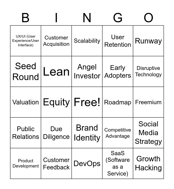 This bingo card has a free space and 75 words: Innovation, Disruption, Scalability, MVP (Minimum Viable Product), Agile, Pivot, Bootstrap, Funding, Incubator, Accelerator, Pitch, Venture Capital, Angel Investor, Seed Round, Series A/B/C, Equity, Crowdfunding, Growth Hacking, Burn Rate, Runway, Exit Strategy, Valuation, Lean, Customer Acquisition, User Retention, Metrics, KPI (Key Performance Indicator), Traction, Revenue Model, Market Fit, Product-Market Fit, Business Model, Go-to-Market Strategy, Competitive Advantage, Disruptive Technology, Early Adopters, B2B (Business-to-Business), B2C (Business-to-Consumer), Freemium, SaaS (Software as a Service), Network Effects, Ecosystem, Stakeholders, Lean Startup, Iteration, Prototyping, Product Development, UX/UI (User Experience/User Interface), Customer Validation, Strategic Partnerships, Value Proposition, Brand Identity, Vision, Mission, Milestones, Revenue Streams, Profitability, Churn Rate, Cohort Analysis, Cash Flow, Due Diligence, Intellectual Property, Patent, Market Share, Business Plan, Roadmap, Branding, Content Marketing, Digital Marketing, Social Media Strategy, Public Relations, Customer Feedback, Agile Development, DevOps and Blockchain.