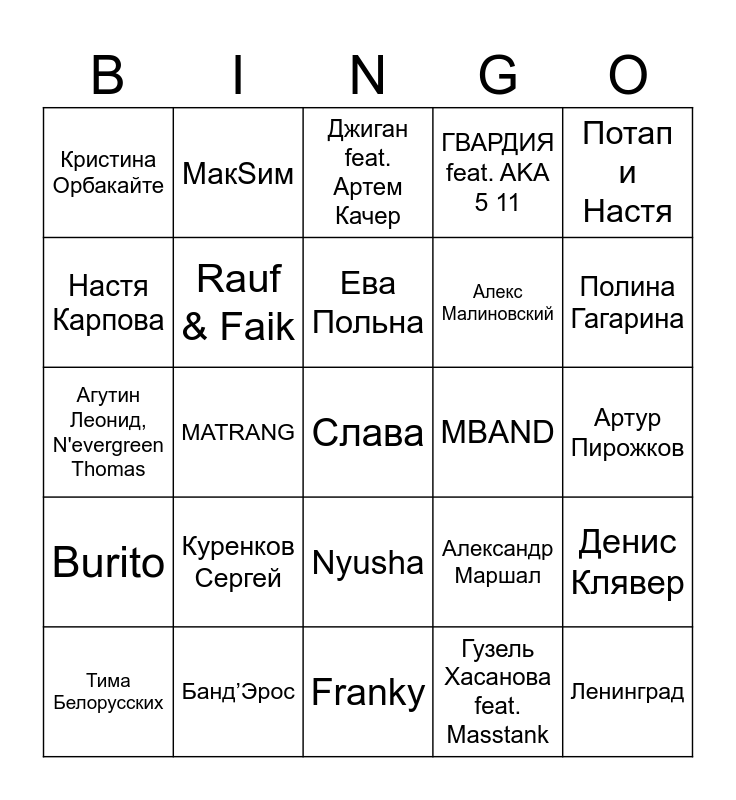 This bingo card has 100 words: PIZZA, Группа Республика, Артур Пирожков, Елена Темникова, ESTRADARADA, Юлианна Караулова, Quest Pistols Show, Натали, Денис Майданов, GAYAZOV$ BROTHER$, Юта, А Студио, Таисия Повалий, Банд’Эрос, Ханна, Лиза Арзамасова, Алекс Малиновский, Наргиз feat. Максим Фадеев, Иван-да-Марья, Ночные Снайперы, Сергей Лазарев, MONATIK, Ани Лорак, #2Маши, Иван Дорн, MBAND, Потап и Настя, Александр Маршал, Элджей, FEDUK, Макс Барских, MATRANG, Кристина Орбакайте, Бублик Михаил, Artik & Asti, Артем Качер, Гузель Хасанова feat. Masstank, Ева Польна, Денис Клявер, IOWA, Дима Догма, Ленинград, Константин Меладзе, Паулина Андреева, Дима Билан, Агутин Леонид, N'evergreen Thomas, Грибы, Полина Гагарина, Джиган feat. Артем Качер, Вера Брежнева, Юлия Савичева, Винтаж, Franky, Alekseev, Елена Князева, Те100стерон, EMIN, Loboda, Егор Крид, MOLLY, Жасмин, Базиль, ГВАРДИЯ feat. AKA 5 11, группа "Градусы", 5sta Family, ЭММА М, Колдун Дмитрий, Валерий Меладзе & Константин Меладзе, Инь-Ян, Руки Вверх!, 30.02, Пика, Баста, Григорий Лепс, Куренков Сергей, Dan Balan, Zivert, Валентин Стрыкало, Verka Serdjuchka, Пропаганда, Настя Карпова, SEREBRO, Lx24, KAZKA, Слава, Монеточка, Nyusha, Ёлка, МакSим, Митя Фомин, Филипп Киркоров, ВИА ГРА, Burito, Инфинити, Газманов Родион, Даниил Данилевский, Тима Белорусских, Rauf & Faik, Oculus, Big Shake, Elvira T, Uma2rman, Zvonkiy and Даша Суворова.