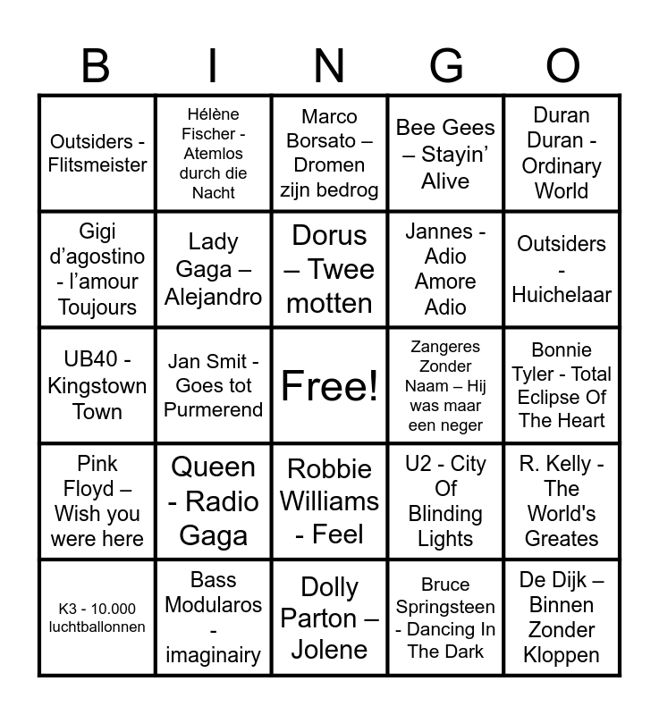 This bingo card has a free space and 72 words: Jacques Herb – Manuela, Hélène Fischer - Atemlos durch die Nacht, Jan Smit - Goes tot Purmerend, Yves Berendse - terug in de tijd, Narcotic - Liquido, Spice Girls - Stop, Bee Gees – Stayin’ Alive, Rolling Stones – Paint it, Black, Jannes - Adio Amore Adio, Kinderen voor kinderen - Op een onbewoond eiland, K3 - 10.000 luchtballonnen, Coldplay – A Sky Full of Stars, Outsiders - Huichelaar, Outsiders - Flitsmeister, Snollebollekes - Engelengezang, UB40 - Kingstown Town, U2 - City Of Blinding Lights, Duran Duran - Ordinary World, Bon Jovi - Living on a Prayer, Bonnie Tyler - Total Eclipse Of The Heart, Queen - Radio Gaga, De Dijk – Binnen Zonder Kloppen, R. Kelly - The World's Greates, Acda en de Munnik - Niet of nooit geweest, Lasgo – Tonight, Avicci – Hey Brother, Charly Lownoise, Mental Theo - Wonderful Days, Cascada - Because the Night, Special D – Come with me, Madonna – Papa Don’t Preach, Bass Modularos - imaginairy, Andre Hazes - ‘t rode licht, OBZ - ik ben kachel, Ammar - de laatste, Bruce Springsteen - Dancing In The Dark, Eiffel 65 - Blue, Golden Earring - When The Lady Smiles, Pink - Get the Party Started, Gigi d’agostino - l’amour Toujours, Jan Biggel - Ons moeder Zeej nog, Robbie Williams - Feel, Borgeous - Tsunami, AHA - take on me, Men at work - Down under, Tina Turner – The best, Pink Floyd – Wish you were here, Metallica – Nothing Else Matters, Chef’s Special - Afraid of the Dark, ABBA – Dancing Queen, AC/DC – Thunderstruck, Linkin Oark – Breaking the Habit, Guus Meeuwis – Het is een nacht, Rob de Nijs – Malle Babbe, Zangeres Zonder Naam – Hij was maar een neger, Gers Pardoel – Ik neem je mee, Davina Michelle – Beat Me, Marco Borsato – Dromen zijn bedrog, Dorus – Twee motten, Linda, Roos & Jessica – Ademnood, Guillermo & Tropical Danny – Toppertje!, The Beach Boys – God Only Knows, Son Mieux – Multicolor, The Beatles – Let it be, Dolly Parton – Jolene, Snow Patrol – Chasing Cars, Rammstein – Du Hast, Lady Gaga – Alejandro, Jebroer, Paul Elstak – Kind van de duivel, Pater Moeskroen – Roodkapje, DJ Parla – Liberté 2007, Gebroeder Ko – Toeter op m’n waterscooter and Stevie Wonder – Happy Birthday.