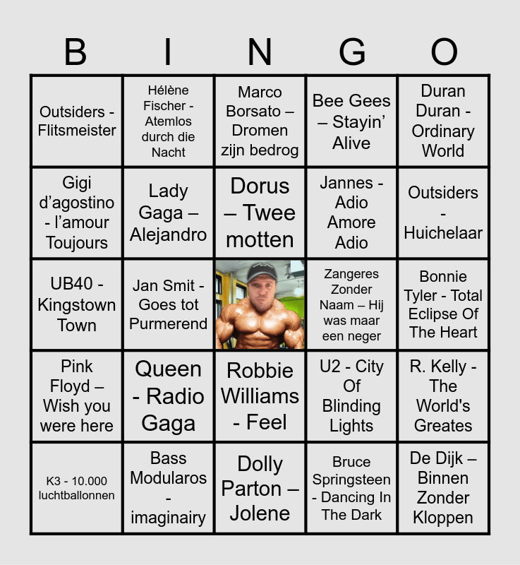 This bingo card has a free space and 72 words: Jacques Herb – Manuela, Hélène Fischer - Atemlos durch die Nacht, Jan Smit - Goes tot Purmerend, Yves Berendse - terug in de tijd, Narcotic - Liquido, Spice Girls - Stop, Bee Gees – Stayin’ Alive, Rolling Stones – Paint it, Black, Jannes - Adio Amore Adio, Kinderen voor kinderen - Op een onbewoond eiland, K3 - 10.000 luchtballonnen, Coldplay – A Sky Full of Stars, Outsiders - Huichelaar, Outsiders - Flitsmeister, Snollebollekes - Engelengezang, UB40 - Kingstown Town, U2 - City Of Blinding Lights, Duran Duran - Ordinary World, Bon Jovi - Living on a Prayer, Bonnie Tyler - Total Eclipse Of The Heart, Queen - Radio Gaga, De Dijk – Binnen Zonder Kloppen, R. Kelly - The World's Greates, Acda en de Munnik - Niet of nooit geweest, Lasgo – Tonight, Avicci – Hey Brother, Charly Lownoise, Mental Theo - Wonderful Days, Cascada - Because the Night, Special D – Come with me, Madonna – Papa Don’t Preach, Bass Modularos - imaginairy, Andre Hazes - ‘t rode licht, OBZ - ik ben kachel, Ammar - de laatste, Bruce Springsteen - Dancing In The Dark, Eiffel 65 - Blue, Golden Earring - When The Lady Smiles, Pink - Get the Party Started, Gigi d’agostino - l’amour Toujours, Jan Biggel - Ons moeder Zeej nog, Robbie Williams - Feel, Borgeous - Tsunami, AHA - take on me, Men at work - Down under, Tina Turner – The best, Pink Floyd – Wish you were here, Metallica – Nothing Else Matters, Chef’s Special - Afraid of the Dark, ABBA – Dancing Queen, AC/DC – Thunderstruck, Linkin Oark – Breaking the Habit, Guus Meeuwis – Het is een nacht, Rob de Nijs – Malle Babbe, Zangeres Zonder Naam – Hij was maar een neger, Gers Pardoel – Ik neem je mee, Davina Michelle – Beat Me, Marco Borsato – Dromen zijn bedrog, Dorus – Twee motten, Linda, Roos & Jessica – Ademnood, Guillermo & Tropical Danny – Toppertje!, The Beach Boys – God Only Knows, Son Mieux – Multicolor, The Beatles – Let it be, Dolly Parton – Jolene, Snow Patrol – Chasing Cars, Rammstein – Du Hast, Lady Gaga – Alejandro, Jebroer, Paul Elstak – Kind van de duivel, Pater Moeskroen – Roodkapje, DJ Parla – Liberté 2007, Gebroeder Ko – Toeter op m’n waterscooter and Stevie Wonder – Happy Birthday.