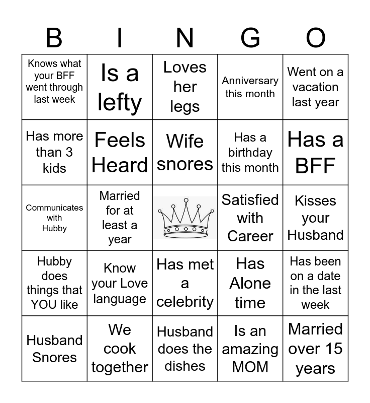 This bingo card has a free space and 29 words: Pampers yourself, We cook together, Loves her legs, Know your Worth, Went on a vacation last year, Knows what your BFF went through last week, Feels Heard, Wife snores, Satisfied with Career, Has been on a date in the last week, Husband Snores, Married for at least a year, Is an amazing MOM, Married over 15 years, Communicates with Hubby, We pray for each other, Husband does the dishes, Has Alone time, Has a BFF, Hubby does things that YOU like, Know your Love language, Happy with yourself, Has a birthday this month, Kisses your Husband, Has more than 3 kids, Is a lefty, Has met a celebrity, Anniversary this month and Loves Football.