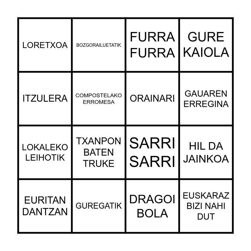 This bingo card has 50 words: KANTU BAT, COMPOSTELAKO ERROMESA, DANTZA GAUA, IZARREN HAUTSA, KOLPE, SAIATZEN NAIZ, ORAINARI, TABERNAKO ARGIAK, ITZULERA, ZUREKIN BATERA, SARRI SARRI, GURE KAIOLA, AITORMENA, ARRASALDE HONETAN, BEHIN BATEAN LOIOLAN, DORAEMON, LOKALEKO LEIHOTIK, TXANPON BATEN TRUKE, MAITE ZAITUT, GAUAREN ERREGINA, EURITAN DANTZAN, GOGOAK, FURRA FURRA, HIL DA JAINKOA, OREKA, HORRELAKO OLATU BATEK HILKO NAU, DRAGOI BOLA, ALDAPAN GORA, LORETXOA, GUREGATIK, LAU TEILATU, LAZTANA, NABIL BANABIL, ASKE MAITTE, NEGUA JOAN DA TA, MIN HAU, TXORIA TXORI, BEGITARA BEGIRA, ZER IZAN, EUSKARAZ BIZI NAHI DUT, ZAINDU MAITE DUZUN HORI, EPERRAK, XALBADORREN HERIOTZEAN, ZURE ATZETIK, BAGARE, BOZGORAILUETATIK, GORA TA GORA BETI, AGUR XIBERUA, EZ GAITU INORK GELDITUKO and ALBOKA.