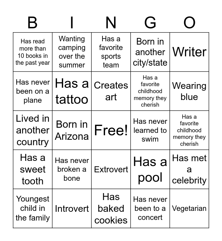 This bingo card has a free space and 40 words: Comes from a big family, Lived in another country, Plays an instrument, Has a tattoo, Introvert, Extrovert, Creates art, Enjoys meeting new people, Writer, Has a sweet tooth, Born in Arizona, Born in another city/state, Vegetarian, Has a favorite childhood memory they cherish, Has never learned to swim, Has never broken a bone, Speaks more than one language fluently, Has read more than 10 books in the past year, Has performed on stage in front of an audience, Has a favorite sports team, Has met a celebrity, Has never been to a concert, Has a favorite childhood memory they cherish, Has never been on a plane, Has a favorite board game or video game, Has gone bungee jumping or zip lining, Has never been on a plane, Has attended a concert, Has a favorite board game or video game, Has never been to the beach, Oldest child in the family, Youngest child in the family, Middle child in family, Has a pool, Wearing blue, Has baked cookies, Loves math, Has a summer birthday, Wanting camping over the summer and Went to the beach over the summer.