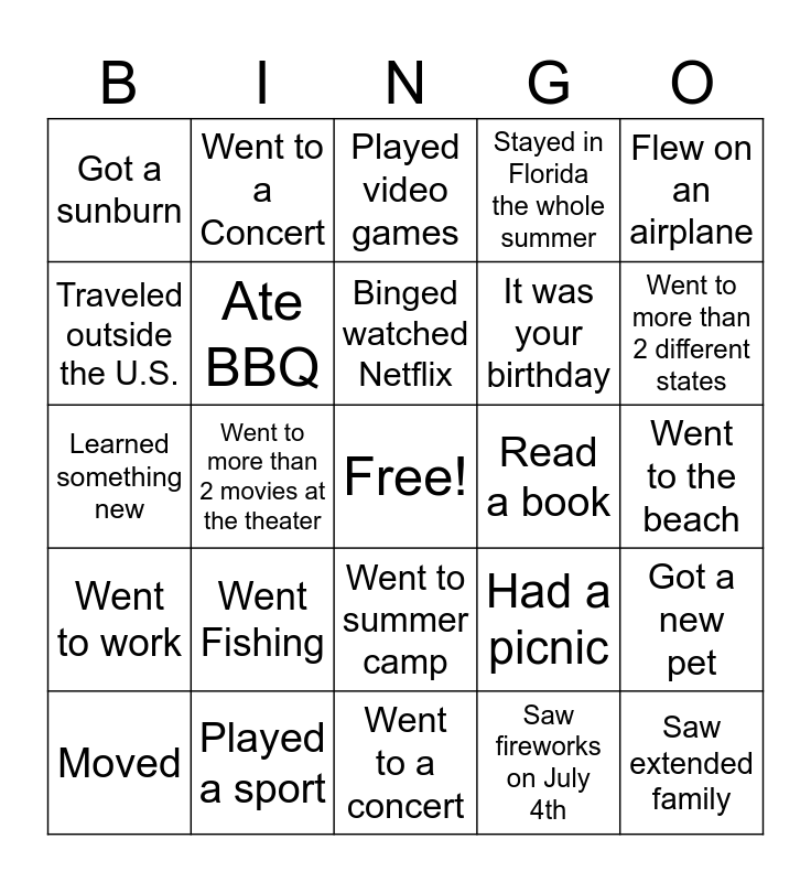 This bingo card has a free space and 24 words: Went Fishing, Played a sport, Binged watched Netflix, Moved, Flew on an airplane, Got a sunburn, Traveled outside the U.S., Went to a Concert, Read a book, Went to summer camp, It was your birthday, Learned something new, Had a picnic, Got a new pet, Ate BBQ, Saw fireworks on July 4th, Went to the beach, Played video games, Went to more than 2 different states, Went to more than 2 movies at the theater, Saw extended family, Went to work, Stayed in Florida the whole summer and Went to a concert.