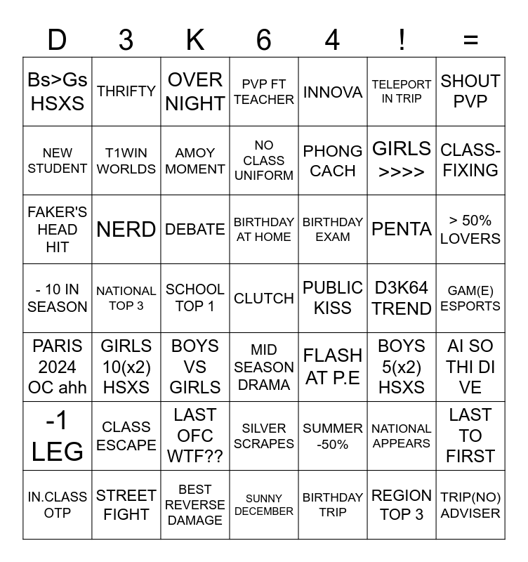 This bingo card has 49 words: NATIONAL APPEARS, GIRLS >>>>, BIRTHDAY TRIP, NATIONAL TOP 3, DEBATE, GAM(E) ESPORTS, THRIFTY, BEST REVERSE DAMAGE, TELEPORT IN TRIP, MID SEASON DRAMA, SHOUT PVP, PVP FT TEACHER, PENTA, BIRTHDAY EXAM, CLASS ESCAPE, D3K64 TREND, NEW STUDENT, CLASS-FIXING, LAST TO FIRST, INNOVA, PHONG CACH, SCHOOL TOP 1, Bs>Gs HSXS, T1WIN WORLDS, IN.CLASS OTP, AMOY MOMENT, > 50% LOVERS, STREET FIGHT, BIRTHDAY AT HOME, NERD, TRIP(NO) ADVISER, PUBLIC KISS, -1 LEG, LAST OFC WTF??, - 10 IN SEASON, FLASH AT P.E, BOYS 5(x2) HSXS, AI SO THI DI VE, FAKER'S HEAD HIT, BOYS VS GIRLS, SILVER SCRAPES, PARIS 2024 OC ahh, CLUTCH, SUNNY DECEMBER, NO CLASS UNIFORM, OVER NIGHT, SUMMER -50%, GIRLS 10(x2) HSXS and REGION TOP 3.