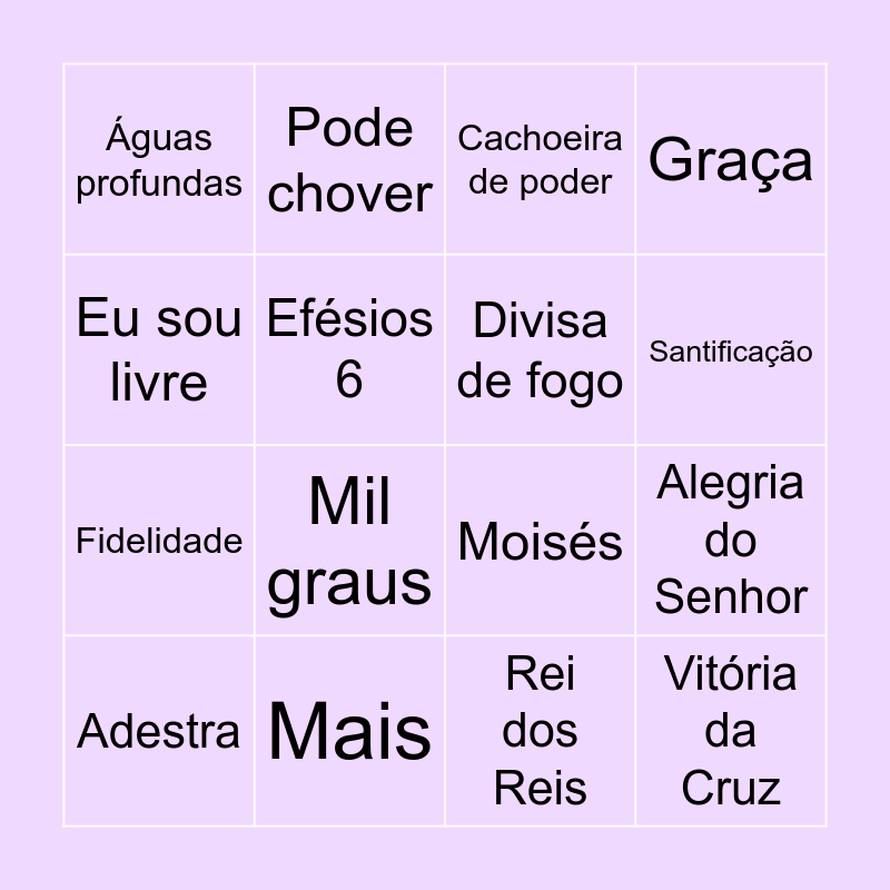 This bingo card has 20 words: Alegria do Senhor, 500 graus, Cachoeira de poder, No meio dos louvores, Adestra, Eu sou livre, Mais, Águas profundas, Fidelidade, Pode chover, Mil graus, Moisés, Efésios 6, Vitória da Cruz, Divisa de fogo, Salmo 91, Santificação, Graça, Rei dos Reis and Faraó ou Deus.