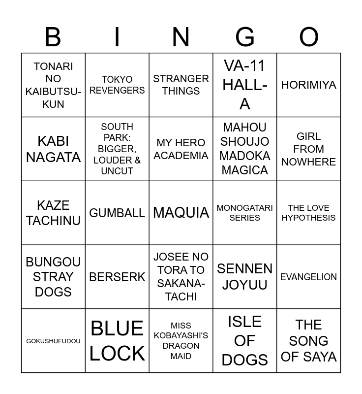 This bingo card has a free space and 24 words: BERSERK, BLUE LOCK, MY HERO ACADEMIA, GOKUSHUFUDOU, HORIMIYA, TONARI NO KAIBUTSU-KUN, KABI NAGATA, TOKYO REVENGERS, MONOGATARI SERIES, JOSEE NO TORA TO SAKANA-TACHI, MAHOU SHOUJO MADOKA MAGICA, KAZE TACHINU, SENNEN JOYUU, EVANGELION, SOUTH PARK: BIGGER, LOUDER & UNCUT, ISLE OF DOGS, THE LOVE HYPOTHESIS, STRANGER THINGS, GIRL FROM NOWHERE, GUMBALL, THE SONG OF SAYA, BUNGOU STRAY DOGS, VA-11 HALL-A and MISS KOBAYASHI'S DRAGON MAID.