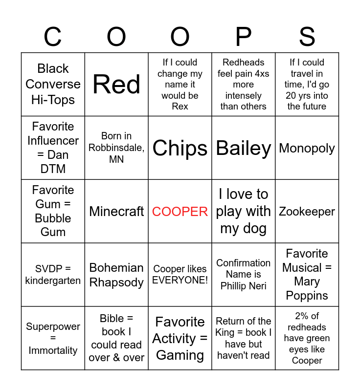 This bingo card has a free space and 44 words: Like everyone, 2% of redheads have green eyes like Cooper, I would Love to visit Hawaii, Superpower = Immortality, Love to be known for living for God, Return of the King = book I have but haven't read, If I could change my name it would be Rex, I would never try to eat Octopus, If I could travel in time, I'd go 20 yrs into the future, Bible = book I could read over & over, Redheads feel pain 4xs more intensely than others, I love to play with my dog, Cooper likes EVERYONE!, Bohemian Rhapsody, Favorite Band = Queen, Favorite Activity = Gaming, Favorite Ice Cream = Cookies & Cream, Favorite Gum = Bubble Gum, Person Jackson, Monopoly, Red, Saving Private Ryan, 7-Up, Black Converse Hi-Tops, Favorite T-Shirt = Anything Funny, Zookeeper, Oliver, CBC, Confirmation Name is Phillip Neri, SVDP = kindergarten, Cooper is Funny, Favorite Musical = Mary Poppins, Favorite Cookie = Chocolate Chip, Favorite Vacation = Mexico, Minecraft, Racoon, MASH, Reese's PB Cups, Chips, Favorite Influencer = Dan DTM, Bailey, Middle Name is Darwin, Born in Robbinsdale, MN and Cooper wears Glasses.