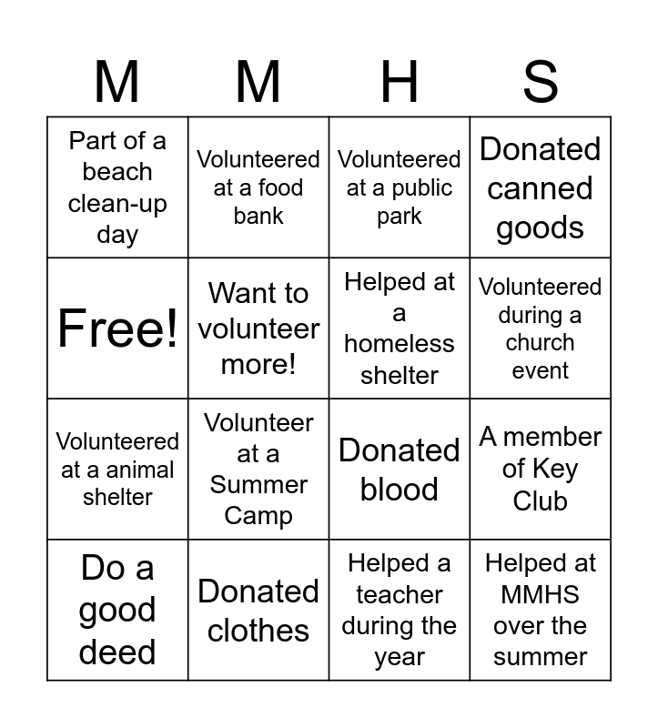 This bingo card has 16 words: Donated clothes, A member of Key Club, Volunteered at a public park, Part of a beach clean-up day, Volunteered at a animal shelter, Volunteered at a food bank, Donated blood, Helped a teacher during the year, Free!, Want to volunteer more!, Do a good deed, Donated canned goods, Volunteer at a Summer Camp, Volunteered during a church event, Helped at a homeless shelter and Helped at MMHS over the summer.
