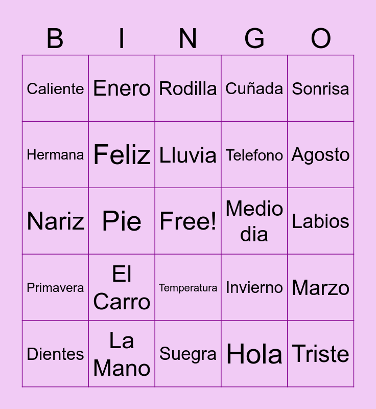 This bingo card has a free space and 24 words: El Carro, La Mano, Lluvia, Dientes, Sonrisa, Caliente, Hermana, Enero, Medio dia, Temperatura, Telefono, Nariz, Invierno, Marzo, Feliz, Hola, Labios, Rodilla, Agosto, Pie, Triste, Primavera, Cuñada and Suegra.