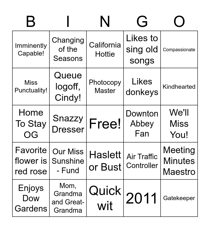 This bingo card has a free space and 42 words: Patient, Photocopy Master, Keeper of the Cash, Our Miss Sunshine - Fund, 2011, Meeting Minutes Maestro, Gatekeeper, Furniture Showroom Guide, California Hottie, Haslett or Bust, We'll Miss You!, Kindhearted, Snazzy Dresser, Compassionate, Jewelry Always Matches Outfit, Air Traffic Controller, Front Desk Freedom Fighter, Home To Stay OG, Interior Decorator, Changing of the Seasons, Miss Punctuality!, “Well, you know…”, Totally Trustworthy, Imminently Capable!, Clever – like a fox, Midland’s Loss, Lansing’s Gain, Likes donkeys, California Girl, Kombucha drinker, Taco enthusiast, Deep faith in God, Favorite flower is red rose, Queue logoff, Cindy!, Quick wit, Modest about her good qualities, Enjoys Dow Gardens, Mom, Grandma and Great-Grandma, Downton Abbey Fan, Sunshine Lady, Takes great meeting minutes, Likes to sing old songs and Plant lady.