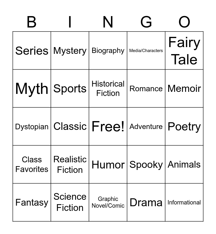This bingo card has a free space and 24 words: Realistic Fiction, Science Fiction, Historical Fiction, Fantasy, Fairy Tale, Series, Myth, Mystery, Adventure, Humor, Romance, Dystopian, Spooky, Animals, Sports, Drama, Poetry, Biography, Memoir, Classic, Informational, Class Favorites, Media/Characters and Graphic Novel/Comic.