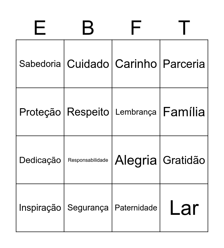 This bingo card has 26 words: Free!, Amor, Família, Abraço, Proteção, Sabedoria, Respeito, Cuidado, Paternidade, Companheirismo, Dedicação, Alegria, Exemplo, União, Gratidão, Apoio, Parceria, Lar, Carinho, Inspiração, Responsabilidade, Conquista, Segurança, Educação, Lembrança and Orgulho.