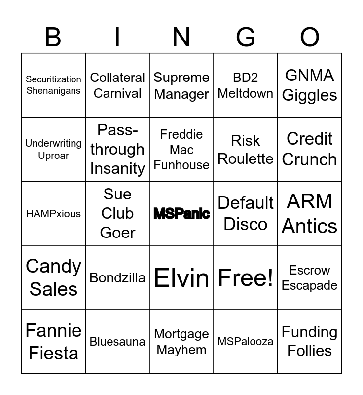 This bingo card has 25 words: Bondzilla, Mortgage Mayhem, Freddie Mac Funhouse, Fannie Fiesta, GNMA Giggles, Securitization Shenanigans, Underwriting Uproar, Collateral Carnival, Default Disco, Elvin, Risk Roulette, HAMPxious, Free!, Escrow Escapade, Pass-through Insanity, Funding Follies, ARM Antics, Supreme Manager, Credit Crunch, Sue Club Goer, MSPanic, Bluesauna, Candy Sales, BD2 Meltdown and MSPalooza.