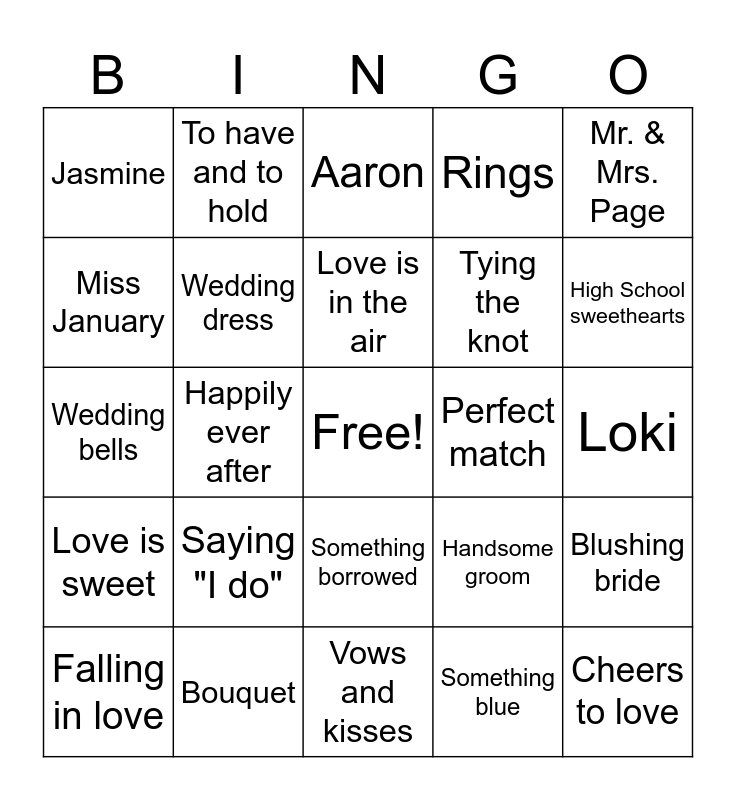 This bingo card has a free space and 24 words: Saying "I do", Bouquet, Love is in the air, Falling in love, Mr. & Mrs. Page, Jasmine, Miss January, To have and to hold, Perfect match, Something borrowed, Tying the knot, Wedding bells, Handsome groom, Blushing bride, Wedding dress, Something blue, Loki, Aaron, High School sweethearts, Happily ever after, Cheers to love, Love is sweet, Rings and Vows and kisses.
