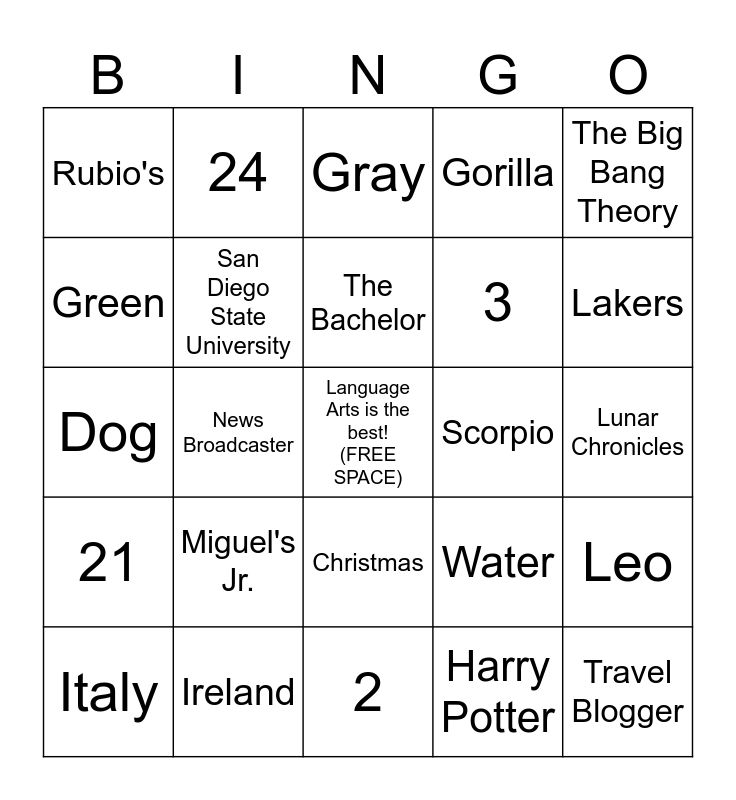 This bingo card has a free space and 27 words: Water, Diet Pepsi, 3, 2, Green, Gray, 24, 21, Scorpio, Leo, Dog, Gorilla, Italy, Ireland, Lakers, Chicago Cubs, San Diego State University, The Bachelor, Miguel's Jr., Rubio's, Lunar Chronicles, Harry Potter, News Broadcaster, Travel Blogger, Christmas, The Big Bang Theory and Thanksgiving.