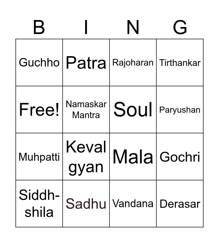 This bingo card has 16 words: Sadhu, Gochri, Rajoharan, Guchho, Muhpatti, Patra, Mala, Vandana, Free!, Namaskar Mantra, Siddh-shila, Tirthankar, Keval gyan, Paryushan, Soul and Derasar.