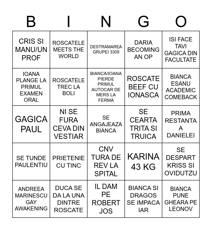 This bingo card has 25 words: PRIETENIE CU TINC, IL DAM PE ROBERT JOS, BIANCA/IOANA PIERDE PRIMUL AUTOCAR DE MERS LA FERMA, ANDREEA MARINESCU GAY AWAKENING, ISI FACE TAVI GAGICA DIN FACULTATE, CRIS SI MANU/UN PROF, IOANA PLANGE LA PRIMUL EXAMEN ORAL, ROSCATELE MEETS THE WORLD, SE CEARTA TRITA SI TRUICA, CNV TURA DE REV LA SPITAL, ROSCATE BEEF CU IONASCA, GAGICA PAUL, KARINA 43 KG, SE DESPART KRISS SI OVIDUTZU, ROSCATELE TREC LA BOLI, BIANCA PUNE GHEARA PE LEONOV, PRIMA RESTANTA A DANIELEI, DESTRAMAREA GRUPEI 3309, BIANCA ESANU ACADEMIC COMEBACK, NI SE FURA CEVA DIN VESTIAR, SE ANGAJEAZA BIANCA, DUCA SE DA LA UNA DINTRE ROSCATE, SE TUNDE PAULENTIU, DARIA BECOMING AN OP and BIANCA SI DRAGOS SE IMPACA IAR.