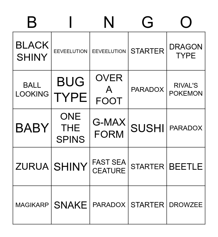 This bingo card has a free space and 24 words: SHINY, SNAKE, OVER A FOOT, MAGIKARP, DRAGON TYPE, BLACK SHINY, BALL LOOKING, EEVEELUTION, SUSHI, FAST SEA CEATURE, PARADOX, BABY, STARTER, BEETLE, BUG TYPE, STARTER, PARADOX, EEVEELUTION, RIVAL'S POKEMON, ONE THE SPINS, DROWZEE, ZURUA, STARTER and PARADOX.