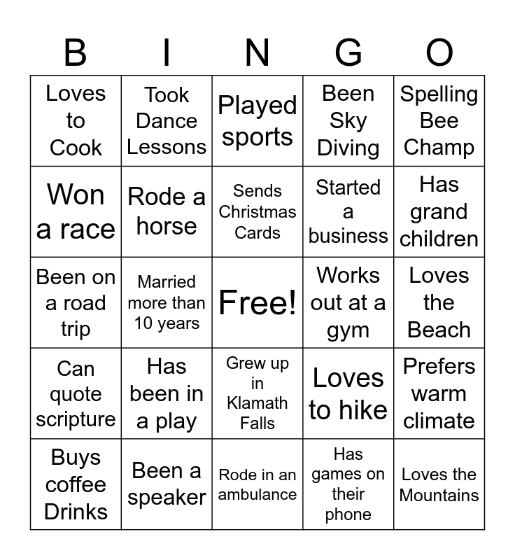 This bingo card has a free space and 24 words: Has been in a play, Been a speaker, Sends Christmas Cards, Buys coffee Drinks, Spelling Bee Champ, Loves to Cook, Won a race, Took Dance Lessons, Works out at a gym, Grew up in Klamath Falls, Started a business, Been on a road trip, Loves to hike, Prefers warm climate, Rode a horse, Has games on their phone, Loves the Beach, Played sports, Has grand children, Married more than 10 years, Loves the Mountains, Can quote scripture, Been Sky Diving and Rode in an ambulance.