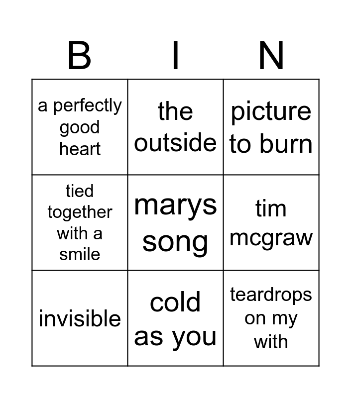 This bingo card has a free space and 8 words: tim mcgraw, picture to burn, the outside, invisible, a perfectly good heart, teardrops on my with, tied together with a smile and cold as you.