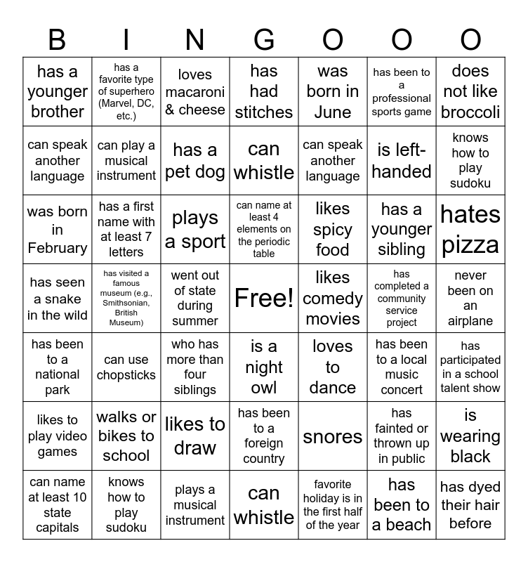 This bingo card has a free space and 58 words: enjoys math, has seen a snake in the wild, likes spicy food, has a first name with at least 7 letters, went out of state during summer, snores, does not like broccoli, is afraid of spiders, can play a musical instrument, has fainted or thrown up in public, has had stitches, walks or bikes to school, who has more than four siblings, can use chopsticks, can whistle, has a younger brother, is left-handed, was born in June, has an older sister, can speak another language, knows how to play sudoku, loves macaroni & cheese, hates pizza, has a younger sibling, is an only child, was born in February, never been on an airplane, favorite ice cream flavor is not vanilla or chocolate, has a pet dog, loves to dance, has a pet cat, likes to play video games, plays a musical instrument, favorite holiday is in the first half of the year, likes comedy movies, is a night owl, likes to draw, can speak another language, can whistle, has been to a foreign country, plays a sport, has dyed their hair before, likes spicy food, has never gone camping before, is wearing black, can name at least 10 state capitals, knows how to play sudoku, can name at least 4 elements on the periodic table, has visited a famous museum (e.g., Smithsonian, British Museum), has been to a beach, has participated in a school talent show, has completed a community service project, has been to a national park, has been to a local music concert, has a favorite type of superhero (Marvel, DC, etc.), has visited a local zoo or aquarium, has been to a professional sports game and has completed a jigsaw puzzle.