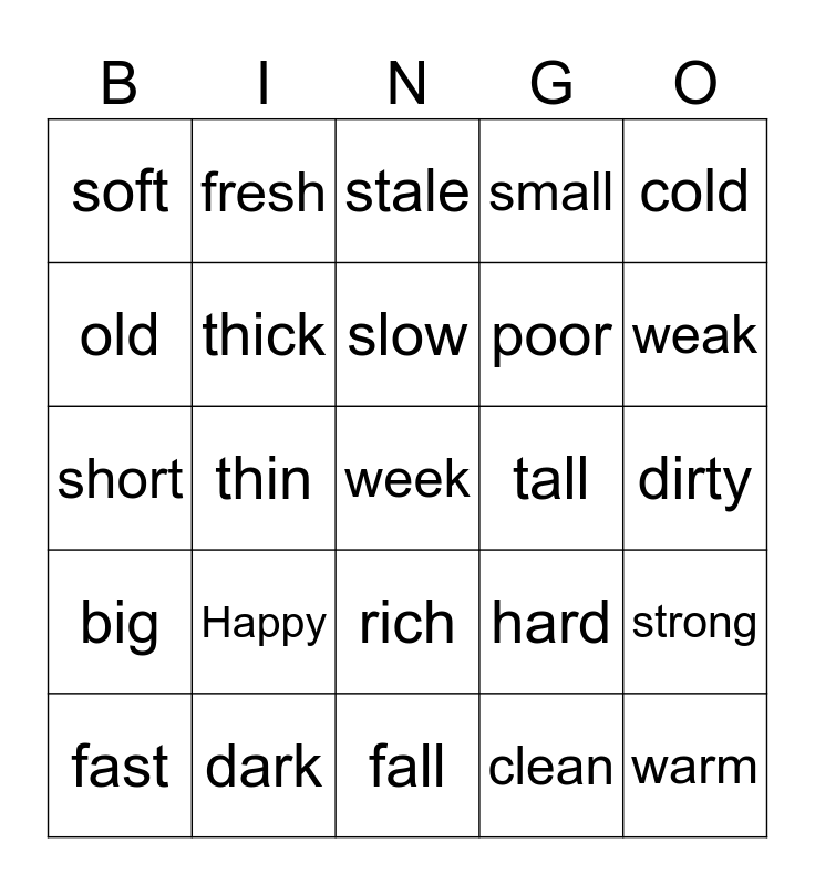This bingo card has a free space and 24 words: Happy, dark, slow, fast, cold, soft, old, fresh, tall, rich, poor, short, hard, strong, thick, clean, dirty, stale, weak, thin, warm, big, small and fall.