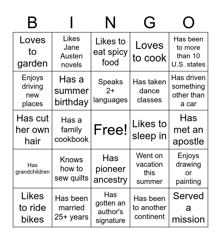 This bingo card has a free space and 59 words: Plays an instrument, Has been married 25+ years, Is left-handed, Has grandchildren, Has been to another continent, Has more than 3 siblings, Has a summer birthday, Loves to bake regularly, Has taken dance classes, Has more than 1 pet, Loves to cook, Was baptized a member as an adult, Enjoys driving new places, Born the same decade as you, Has played on sports team in last 5 years, Loves to garden, Served a mission, Has been to more than 10 U.S. states, Enjoys hiking, Speaks 2+ languages, Likes to sleep in, Likes to eat spicy food, Likes to ride bikes, Enjoys drawing or painting, Has lived in more than 3 states, Likes to sing, Likes scary movies, Is a night owl (stays up late), Has driven something other than a car, Has a winter birthday, Likes going to the beach, Has never broken a bone, Born in Washington state, Graduated from BYU, Likes Jane Austen novels, Enjoys playing card games, Watched 2024 Olympic events, Has a family cookbook, Has won an award, Has cut her own hair, Has been to the conference center, Knows how to sew quilts, Has met an apostle, Has run a 10k or longer, Loves learning about history, Has been on a cruise, Favorite season is spring, Wasn't baptized in a font, Has pioneer ancestry, Has gotten an author's signature, Likes Hallmark movies, Enjoys BBQing, Only daughter in family, Was in band (or in a band), Favorite season is fall, Went on vacation this summer, Has performed on a stage, Keeps a journal and Has moved 7+ times.
