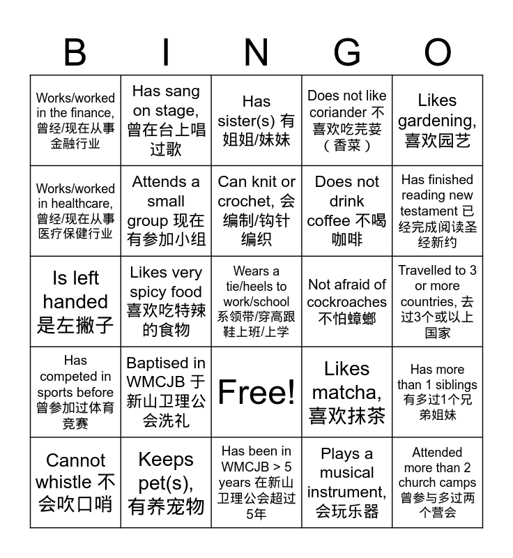 This bingo card has 26 words: Free!, Plays a musical instrument, 会玩乐器, Can knit or crochet, 会编制/钩针编织, Keeps pet(s), 有养宠物, Likes gardening, 喜欢园艺, Works/worked in the finance, 曾经/现在从事金融行业, Works/worked in healthcare, 曾经/现在从事医疗保健行业, Has sang on stage, 曾在台上唱过歌, Travelled to 3 or more countries, 去过3个或以上国家, Likes matcha, 喜欢抹茶, Does not drink coffee 不喝咖啡, Is left handed 是左撇子, Has more than 1 siblings 有多过1个兄弟姐妹, Cannot whistle 不会吹口哨, Likes very spicy food 喜欢吃特辣的食物, Has finished reading the bible at least once 至少完成阅读圣经一次, Does not like coriander 不喜欢吃芫荽(香菜), Has competed in sports before 曾参加过体育竞赛, Has sister(s) 有姐姐/妹妹, Wears a tie/heels to work/school 系领带/穿高跟鞋上班/上学, Has finished reading new testament 已经完成阅读圣经新约, Has been in WMCJB > 5 years 在新山卫理公会超过5年, Not afraid of cockroaches 不怕蟑螂, Baptised in WMCJB 于新山卫理公会洗礼, Attends a small group 现在有参加小组 and Attended more than 2 church camps 曾参与多过两个营会.