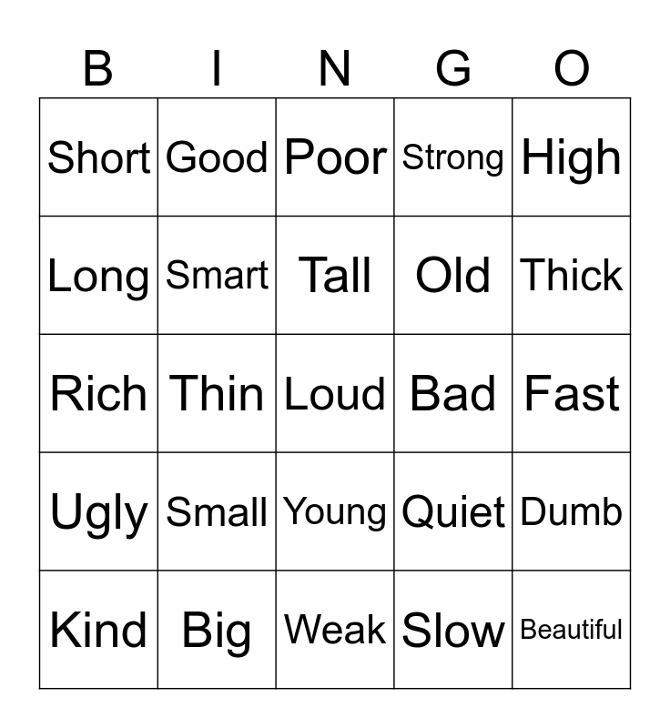This bingo card has a free space and 24 words: Small, Big, Tall, Kind, High, Short, Long, Good, Bad, Young, Old, Rich, Quiet, Dumb, Smart, Slow, Fast, Poor, Thick, Thin, Beautiful, Ugly, Strong and Weak.