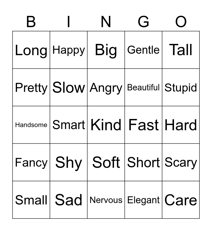 This bingo card has a free space and 24 words: Shy, Sad, Angry, Small, Tall, Long, Pretty, Happy, Fast, Soft, Beautiful, Handsome, Short, Scary, Slow, Elegant, Hard, Big, Stupid, Smart, Care, Fancy, Gentle and Nervous.
