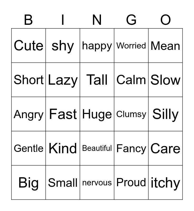 This bingo card has a free space and 24 words: Kind, Small, Tall, Big, Mean, Cute, Short, shy, Clumsy, Beautiful, Calm, Angry, Fancy, Care, Lazy, Proud, Silly, happy, Slow, Fast, itchy, Gentle, Worried and nervous.