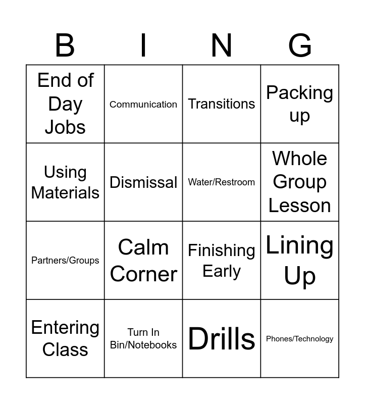 This bingo card has 17 words: Free!, Entering Class, Communication, Transitions, Lining Up, Using Materials, Calm Corner, Water/Restroom, Whole Group Lesson, Partners/Groups, Turn In Bin/Notebooks, Finishing Early, Packing up, End of Day Jobs, Dismissal, Drills and Phones/Technology.