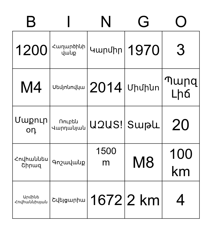 This bingo card has a free space and 26 words: 1500 m, 2 km, 2014, Շվեյցարիա, 3, 1200, M4, Հաղարծինի վանք, 20, M8, Միմինո, Մաքուր օդ, 100 km, Արմինե Հովհաննիսյան, Ռուբեն Վարդանյան, արջեր, 1970, Հովհաննես Շիրազ, Կարմիր, 4, Պարզ Լիճ, 1672, Տաթև, Գոշավանք, Սեմյոնովկա and Պապանինոյում.