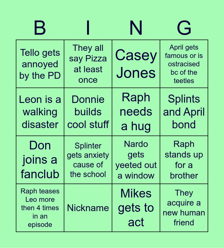 This bingo card has 16 words: Nickname, Raph stands up for a brother, Casey Jones, Tello gets annoyed by the PD, Don joins a fanclub, They all say Pizza at least once, Nardo gets yeeted out a window, Mikes gets to act, Leon is a walking disaster, Donnie builds cool stuff, Raph teases Leo more then 4 times in an episode, April gets famous or is ostracised bc of the teetles, Splinter gets anxiety cause of the school, Splints and April bond, Raph needs a hug and They acquire a new human friend.