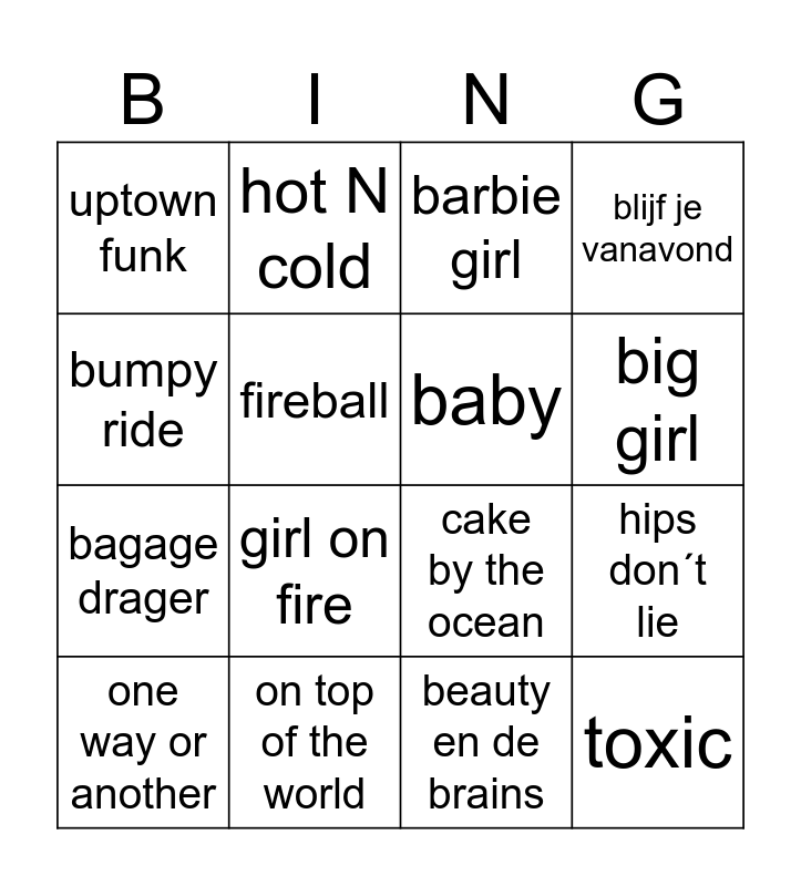 This bingo card has 26 words: murder on the dance floor, verliefd op je moeder, big girl, samba de janeiro, bumpy ride, uptown funk, fireball, hot N cold, beauty en de brains, california gurls, bagage drager, cake by the ocean, single ladies, Free!, hips don´t lie, party in the U.S.A, blijf je vanavond, toxic, barbie girl, one way or another, girl on fire, classic, on top of the world, dancing queen, baby and since u been gone.