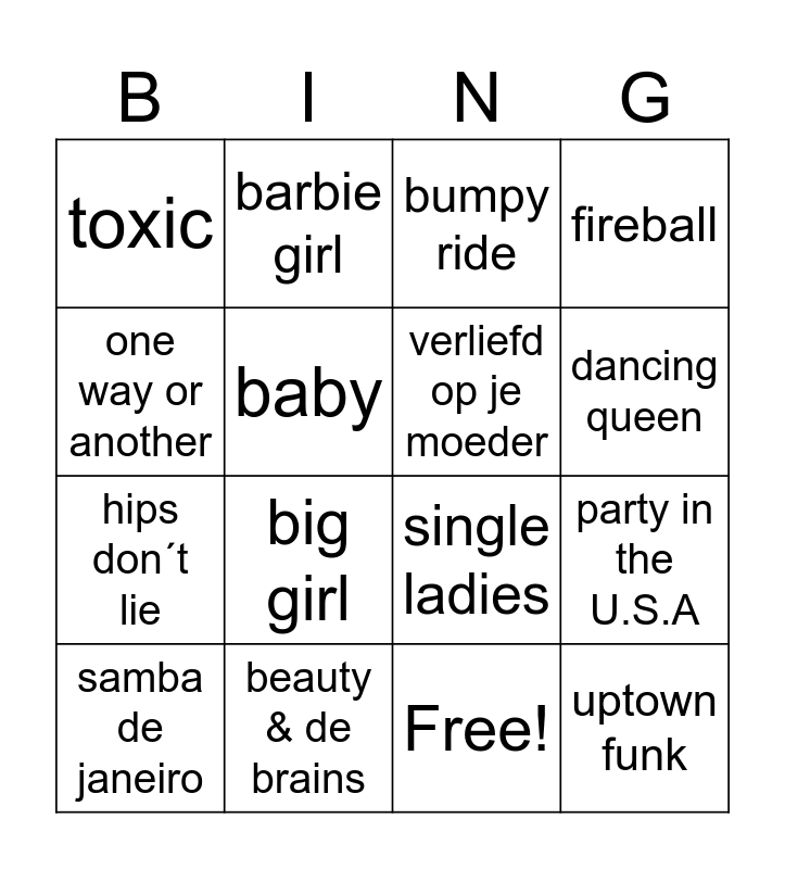 This bingo card has 26 words: since u been gone, girl on fire, dancing queen, classic, one way or another, toxic, baby, barbie girl, Free!, on top of the world, hips don´t lie, single ladies, cake by the ocean, hot N cold, party in the U.S.A, california gurls, fireball, uptown funk, bumpy ride, samba de janeiro, big girl, blijf je vanavond, beauty & de brains, bagagedrager, verliefd op je moeder and murder on the dancefloor.