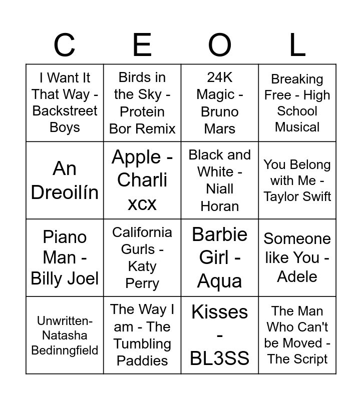 This bingo card has 52 words: Saor!, Unwritten- Natasha Bedinngfield, Party in the USA - Miley Cyrus, Texas Hold 'Em - Beyoncé, Stick Season - Noah Kahan, Too Sweet - Hozier, Birds in the Sky - Protein Bor Remix, Iris - The Goo Goo Dolls, Apple - Charli xcx, Stargazing - Myles Smith, Black and White -Niall Horan, Candy - Paolo Nuitini, Crazy What Love Can Do - Becky Hill, Take My Hand - Picture This, Feather - Sabrina Carpenter, I remember everything - Zach Bryan, You Belong with Me - Taylor Swift, The Way I am - The Tumbling Paddies, Geronimo - Sheppard, An Dreoilín, Someone like You - Adele, Set Fire to The Rain - Adele, I Want It That Way - Backstreet Boys, Piano Man - Billy Joel, King - Years and Years, Beauty and the Beat- Justin Bieber, Starships - Nikki Minaj, Steal My Girl - One Direction, California Gurls - Katy Perry, Murder on the Dancefloor - Ellis Bexter, Mr. Brightside - The Killers, Breaking Free - High School Musical, Close to You - Gracie Abrams, Misses - Dominic Fike, Summertime Sadness - Lana Del Rey, 24K Magic - Bruno Mars, Macerena - Los Del Rio, Baby - Justin Bieber, Tik Tok - Kesha, I Gotta Feeling - Black Eyed Peas, Cotton Eyed Joe - Rednex, Kisses - BL3SS, The Man Who Can't be Moved - The Script, When You're Looking Like That - Westlife, Wannabe - Spice Girls, Dancing Queen - Mama Mia, Shake it Off - Taylor Swift, Barbie Girl - Aqua, Waka Waka - Shakira, Low - Flo Rida, Don't Stop Believin' - Journey and A Sky Full of Stars - Coldplay.