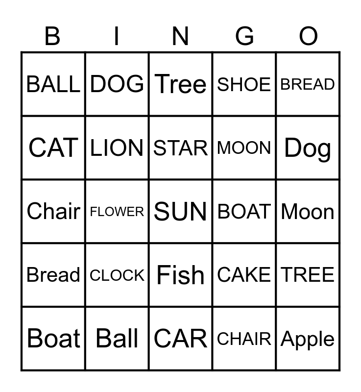 This bingo card has 50 words: APPLE, SUN, FISH, CAR, CLOCK, CUP, DOG, MILK, CAT, PEN, LION, SHOE, TREE, CAKE, BOOK, HOUSE, STAR, BOAT, BIRD, BREAD, FLOWER, CHAIR, BALL, MOON, HAT, Apple, Dog, Sun, Tree, Fish, Cat, Book, Car, House, Ball, Bird, Flower, Lion, Star, Moon, Cup, Hat, Pen, Shoe, Boat, Chair, Milk, Cake, Bread and Clock.