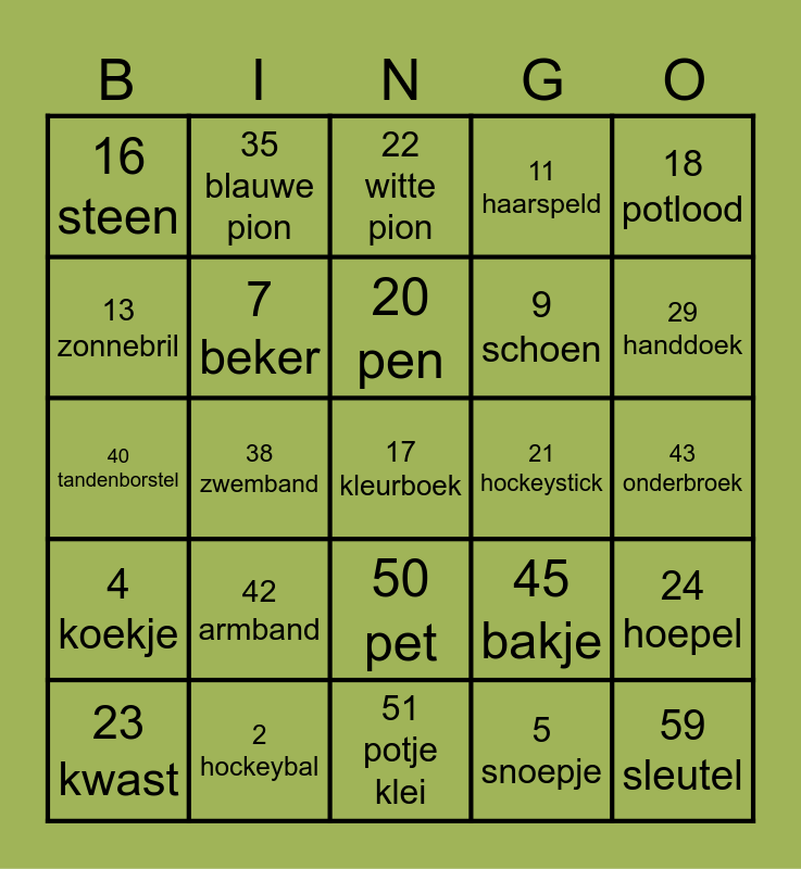 This bingo card has 60 words: 1 wasknijper, 2 hockeybal, 3 bitje, 4 koekje, 5 snoepje, 6 theezakje, 7 beker, 8 euro, 9 schoen, 10 wc rol, 11 haarspeld, 12 haarelastiek, 13 zonnebril, 14 knuffel, 15 sok, 16 steen, 17 kleurboek, 18 potlood, 19 stift, 20 pen, 21 hockeystick, 22 witte pion, 23 kwast, 24 hoepel, 25 vork, 26 lepel, 27 mes, 28 plakband, 29 handdoek, 30 chocolade, 31 leesboek, 32 autootje, 33 schepje, 34 rode pion, 35 blauwe pion, 36 gele pion, 37 waxinelichtje, 38 zwemband, 39 dobbelsteen, 40 tandenborstel, 41 tijdschrift, 42 armband, 43 onderbroek, 44 touwtje, 45 bakje, 46 hesje, 47 envelop, 48 bloemetje, 49 duplosteentje, 50 pet, 51 potje klei, 52 stickervel, 53 gum, 54 stuiterbal, 55 haarborstel, 56 stukje karton, 57 uitsteekvormpje, 58 ballon, 59 sleutel and 60 schroef.