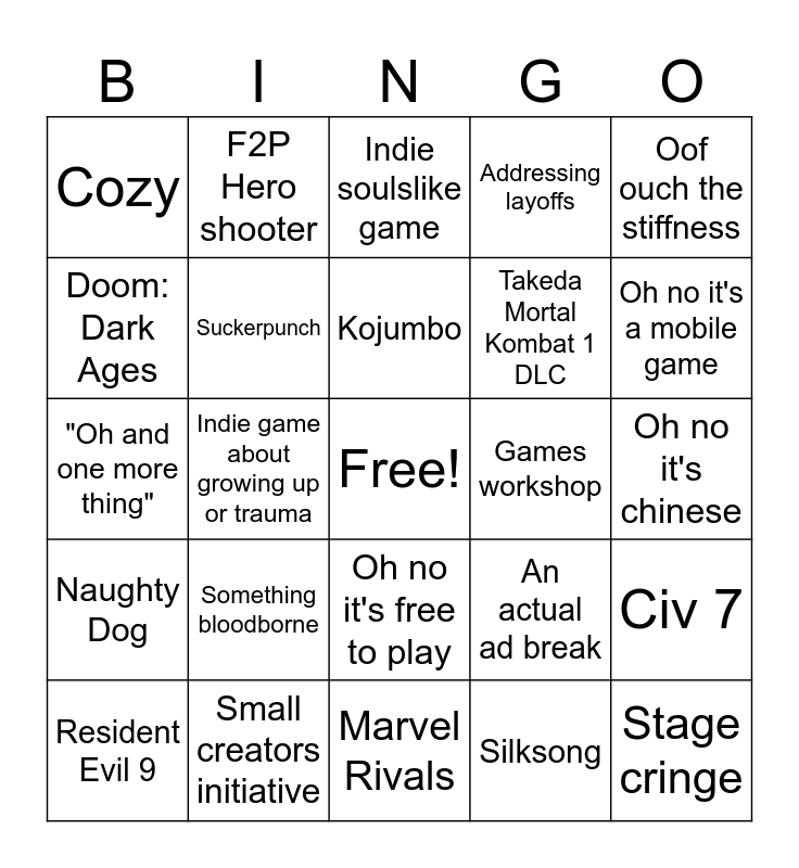 This bingo card has a free space and 42 words: Focus entertainment, Kojumbo, Some chinese game no one heard about, Something bloodborne, Silksong, Civ 7, Stage cringe, Too many particles in my Unreal game, Indie soulslike game, Oh no it's free to play, Oh no it's chinese, Oh no it's a mobile game, Indie game about growing up or trauma, Oof ouch the stiffness, Some arcade collection with games from 20+ years ago, An actual ad break, Cringe real actors sketch, "Oh and one more thing", Goofy dance intro, F2P Hero shooter, Doom: Dark Ages, Shadow drop, Creator initiative, Cozy, System Shock 3, Nexon, Takeda Mortal Kombat 1 DLC, Fortnite Collab, Le random game, Deadlock (wishful thinking), In-Game event, Naughty Dog, Suckerpunch, Marvel Rivals, Dice's next battlefield, Resident Evil 9, Small creators initiative, Games workshop, Subnautica 2, Roguelite, Addressing layoffs and Celebrity feature.